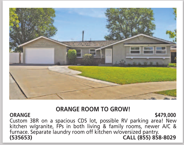 ORANGE $479,000 Custom 3BR on a spacious CDS lot, possible RV parking area! New kitchen w/granite, FPs in both living & family rooms, newer A/C & furnace. Separate laundry room off kitchen w/oversized pantry. (535653) CALL (855) 858-8029