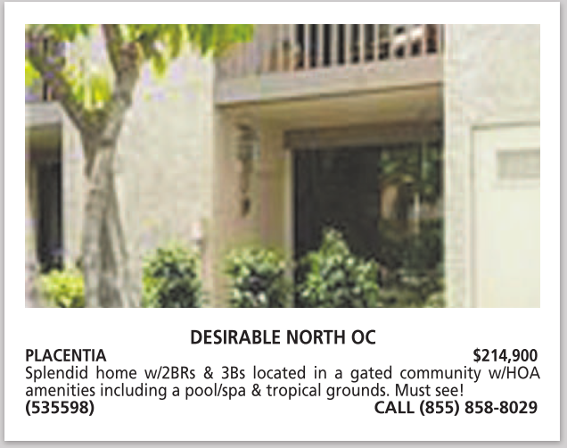 DESIRABLE NORTH OC PLACENTIA $214,900 Splendid home w/2BRs & 3Bs located in a gated community w/HOA amenities including a pool/spa & tropical grounds. Must see! (535598) CALL (855) 858-8029