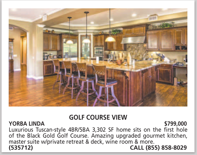 GOLF COURSE VIEW YORBA LINDA $799,000 Luxurious Tuscan-style 4BR/5BA 3,302 SF home sits on the first hole of the Black Gold Golf Course. Amazing upgraded gourmet kitchen, master suite w/private retreat & deck, wine room & more. (535712) CALL (855) 858-8029