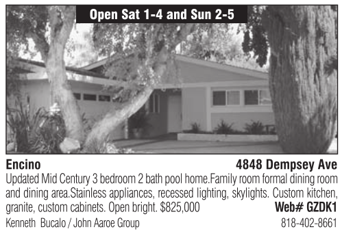 Encino 4848 Dempsey Ave Updated Mid Century 3 bedroom 2 bath pool home.Family room formal dining room and dining area.Stainless appliances, recessed lighting, skylights. Custom kitchen, granite, custom cabinets. Open bright. $825,000 Web# GZDK1