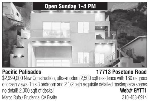 Pacific Palisades 17713 Posetano Road $2,999,000 New Construction, ultra-modern 2,500 sqft residence with 180 degrees of ocean views! This 3 bedroom and 2 1/2 bath exquisite detailed masterpiece spares no detail! 2,000 sqft of decks! Web# GYTT1 Open Sunday 1-4 PM Marco Rufo / Prudential CA Realty 310-488-6914
