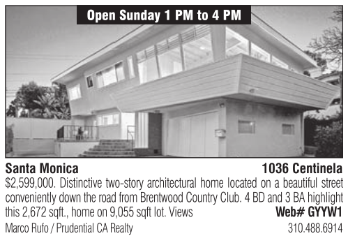 Open Sunday 1 PM to 4 PM Santa Monica 1036 Centinela $2,599,000. Distinctive two-story architectural home located on a beautiful street conveniently down the road from Brentwood Country Club. 4 BD and 3 BA highlight this 2,672 sqft., home on 9,055 sqft lot. Views Web# GYYW1 Marco Rufo / Prudential CA Realty 310.488.6914