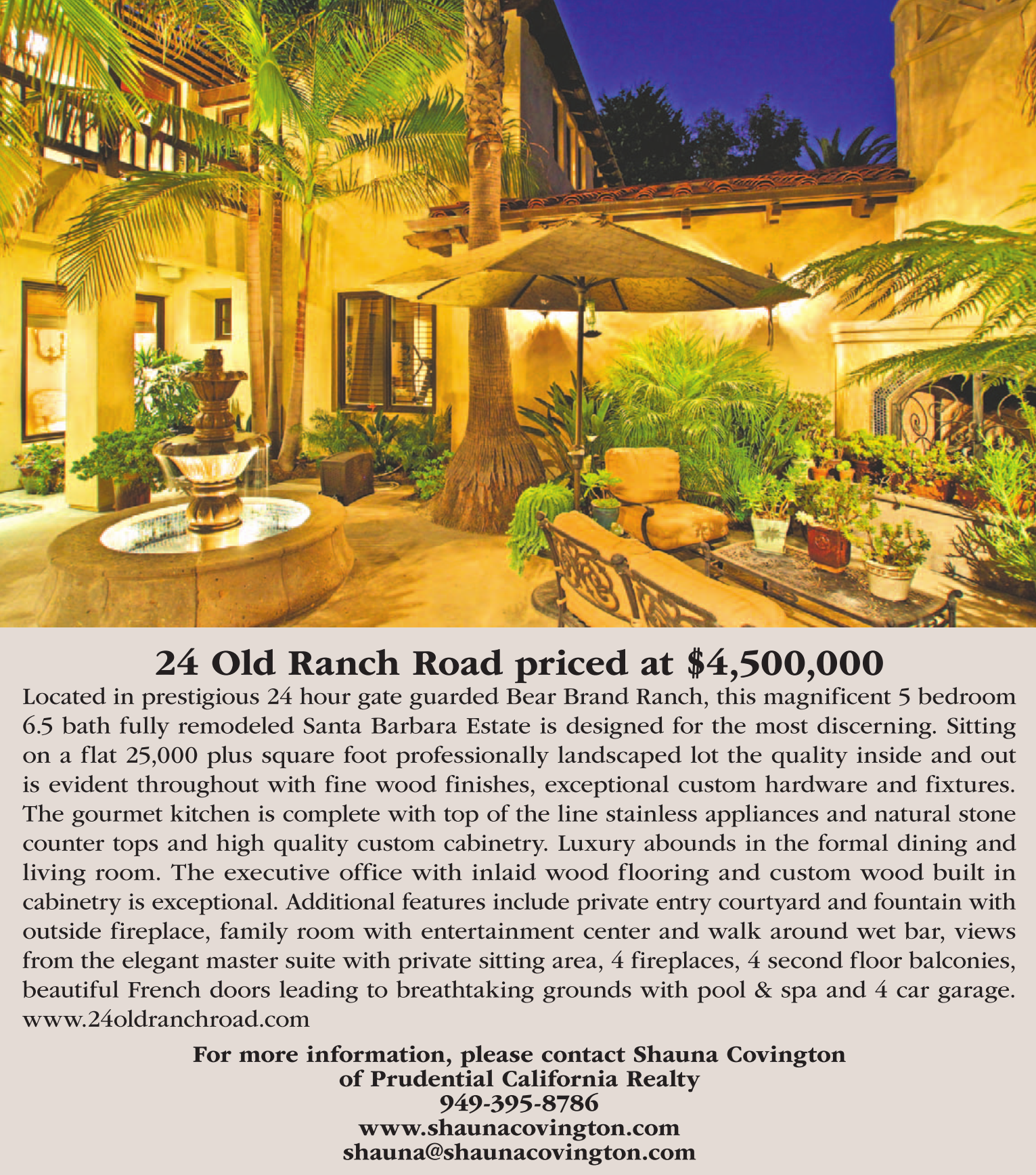 24 Old Ranch Road priced at $4,500,000 Located in prestigious 24 hour gate guarded Bear Brand Ranch, this magnificent 5 bedroom 6.5 bath fully remodeled Santa Barbara Estate is designed for the most discerning. Sitting on a flat 25,000 plus square foot professionally landscaped lot the quality inside and out is evident throughout with fine wood finishes, exceptional custom hardware and fixtures. The gourmet kitchen is complete with top of the line stainless appliances and natural stone counter tops and high quality custom cabinetry. Luxury abounds in the formal dining and living room. The executive office with inlaid wood flooring and custom wood built in cabinetry is exceptional. Additional features include private entry courtyard and fountain with outside fireplace, family room with entertainment center and walk around wet bar, views from the elegant master suite with private sitting area, 4 fireplaces, 4 second floor balconies, beautiful French doors leading to breathtaking grounds with pool & spa and 4 car garage. www.24oldranchroad.com  For more information, please contact Shauna Covington of Prudential California Realty 949-395-8786 www.shaunacovington.com shauna@shaunacovington.com