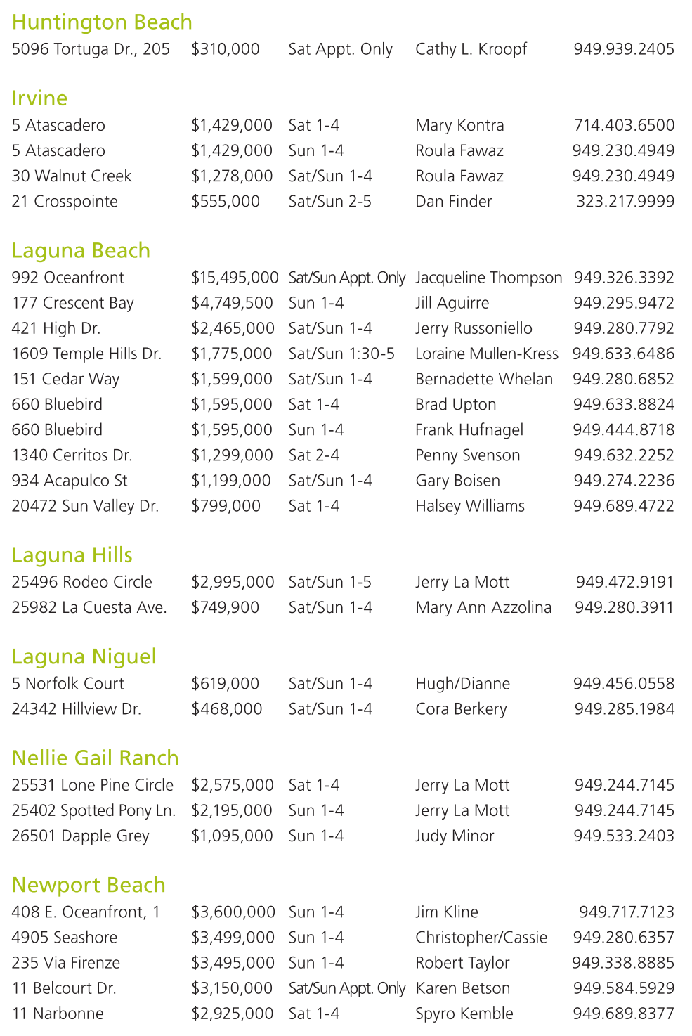 992 Oceanfront $15,495,000 Sat/Sun Appt. Only Jacqueline Thompson 949.326.3392 177 Crescent Bay $4,749,500 Sun 1-4 Jill Aguirre 949.295.9472 421 High Dr. $2,465,000 Sat/Sun 1-4 Jerry Russoniello 949.280.7792 1609 Temple Hills Dr. $1,775,000 Sat/Sun 1:30-5 Loraine Mullen-Kress 949.633.6486 151 Cedar Way $1,599,000 Sat/Sun 1-4 Bernadette Whelan 949.280.6852 660 Bluebird $1,595,000 Sat 1-4 Brad Upton 949.633.8824 660 Bluebird $1,595,000 Sun 1-4 Frank Hufnagel 949.444.8718 1340 Cerritos Dr. $1,299,000 Sat 2-4 Penny Svenson 949.632.2252 934 Acapulco St $1,199,000 Sat/Sun 1-4 Gary Boisen 949.274.2236 20472 Sun Valley Dr. $799,000 Sat 1-4 Halsey Williams 949.689.4722