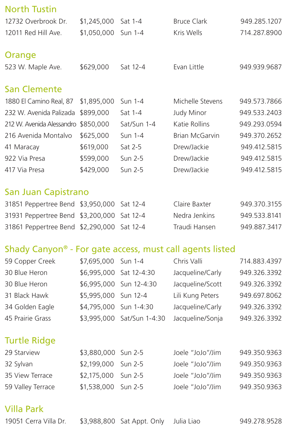31851 Peppertree Bend $3,950,000 Sat 12-4 Claire Baxter 949.370.3155 31931 Peppertree Bend $3,200,000 Sat 12-4 Nedra Jenkins 949.533.8141 31861 Peppertree Bend $2,290,000 Sat 12-4 Traudi Hansen 949.887.3417
