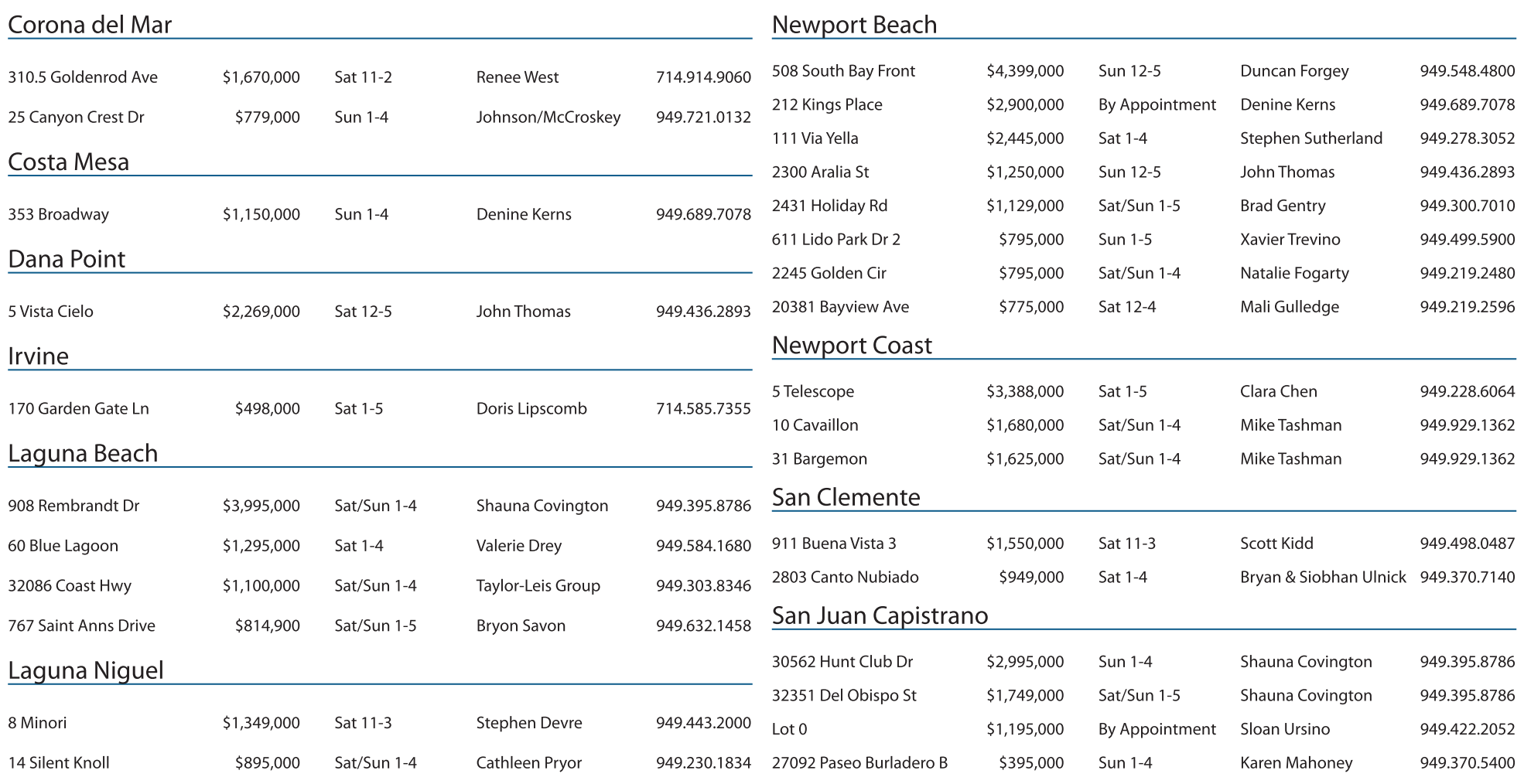 31 Bargemon $1,625,000 Sat/Sun 1-4 Mike Tashman 949.929.1362