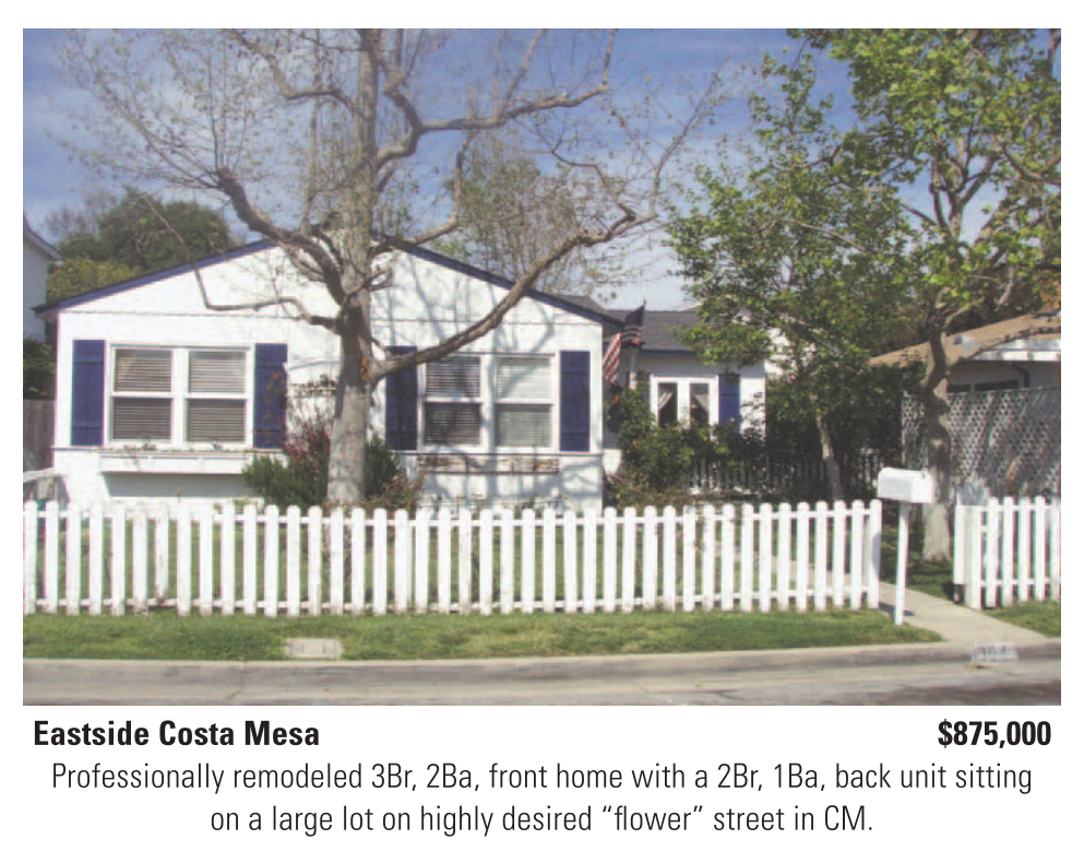 Eastside Costa Mesa $875,000 Professionally remodeled 3Br, 2Ba, front home with a 2Br, 1Ba, back unit sitting on a large lot on highly desired “fl ower” street in CM.