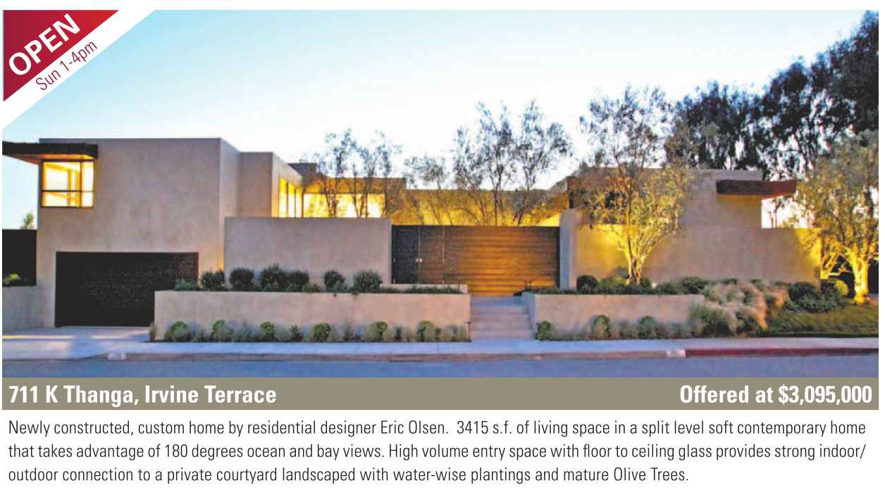 711 K Thanga, Irvine Terrace Offered at $3,095,000 Newly constructed, custom home by residential designer Eric Olsen. 3415 s.f. of living space in a split level soft contemporary home that takes advantage of 180 degrees ocean and bay views. High volume entry space with fl oor to ceiling glass provides strong indoor/ outdoor connection to a private courtyard landscaped with water-wise plantings and mature Olive Trees.