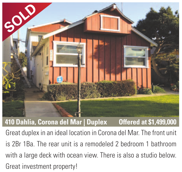 410 Dahlia, Corona del Mar | Duplex Offered at $1,499,000 Great duplex in an ideal location in Corona del Mar. The front unit is 2Br 1Ba. The rear unit is a remodeled 2 bedroom 1 bathroom with a large deck with ocean view. There is also a studio below. Great investment property!