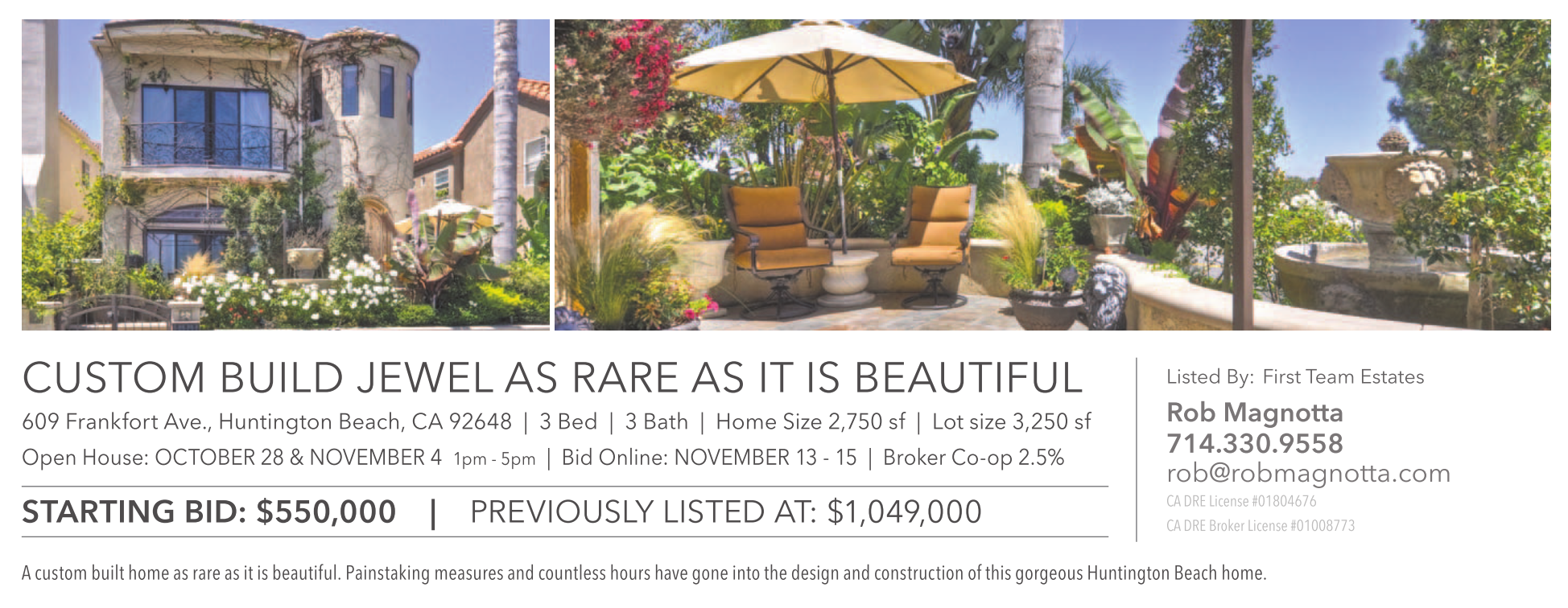 CUSTOM BUILD JEWEL AS RARE AS IT IS BEAUTIFUL 609 Frankfort Ave., Huntington Beach, CA 92648 | 3 Bed | 3 Bath | Home Size 2,750 sf | Lot size 3,250 sf Open House: OCTOBER 28 & NOVEMBER 4 1pm - 5pm | Bid Online: NOVEMBER 13 - 15 | Broker Co-op 2.5% STARTING BID: $550,000 | PREVIOUSLY LISTED AT: $1,049,000 Listed By: First Team Estates Rob Magnotta 714.330.9558 rob@robmagnotta.com CA DRE License #01804676 CA DRE Broker License #01008773 A custom built home as rare as it is beautiful. Painstaking measures and countless hours have gone into the design and construction of this gorgeous Huntington Beach home.