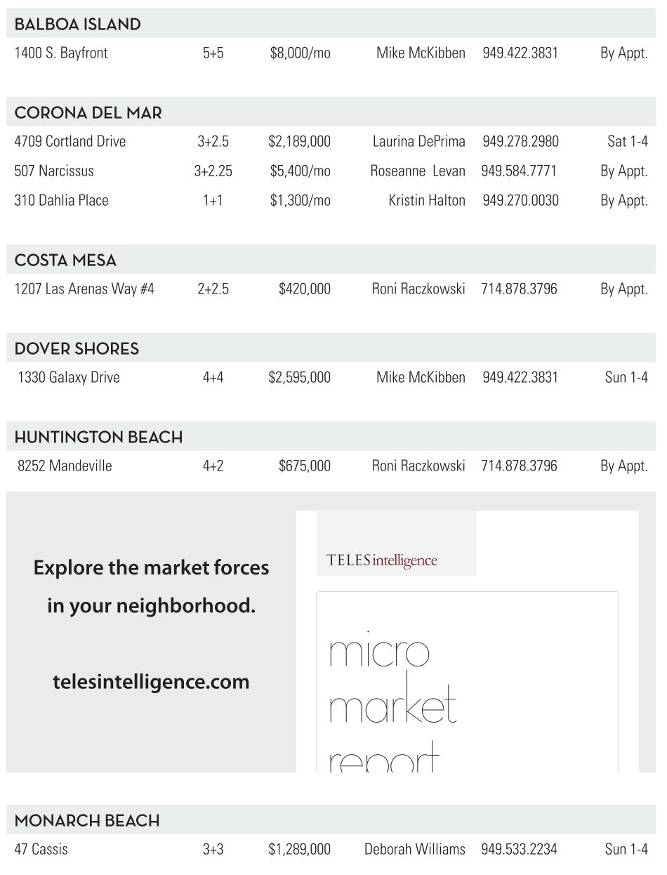 BALBOA IS ND 1400 S. Bayfront 5+5 $8,000/mo Mike McKibben 949.422.3831 By Appt. CORONA DEL MAR 4709 Cortland Drive 3+2.5 $2,189,000 Laurina DePrima 949.278.2980 Sat 1-4 507 Narcissus 3+2.25 $5,400/mo Roseanne Levan 949.584.7771 By Appt. 310 Dahlia Place 1+1 $1,300/mo Kristin Halton 949.270.0030 By Appt. COSTA MESA 1207 Las Arenas Way #4 2+2.5 $420,000 Roni Raczkowski 714.878.3796 By Appt. DOVER SHORES 1330 Galaxy Drive 4+4 $2,595,000 Mike McKibben 949.422.3831 Sun 1-4 HUNTINGTON BEACH 8252 Mandeville 4+2 $675,000 Roni Raczkowski 714.878.3796 By Appt. Explore the market forces in your neighborhood. telesintelligence.com TELESintelligence micro market report MONARCH BEACH 47 Cassis 3+3 $1,289,000 Deborah Williams 949.533.2234 Sun 1-4