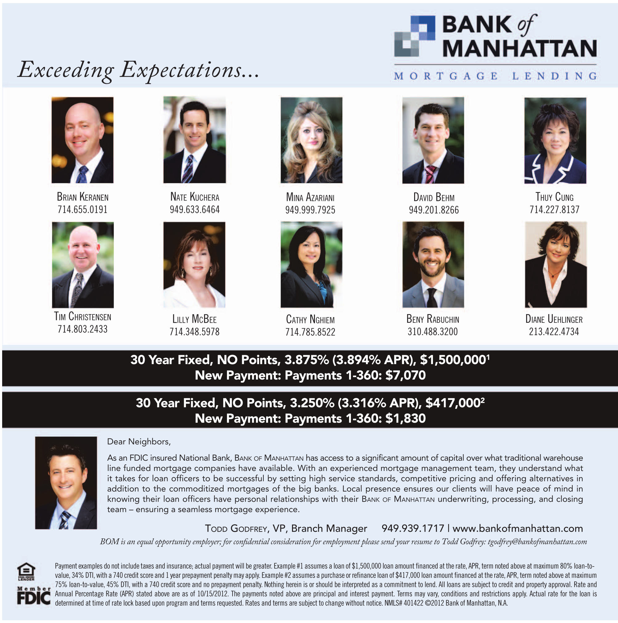 Payment examples do not include taxes and insurance; actual payment will be greater. Example #1 assumes a loan of $1,500,000 loan amount financed at the rate, APR, term noted above at maximum 80% loan-tovalue, 34% DTI, with a 740 credit score and 1 year prepayment penalty may apply. Example #2 assumes a purchase or refinance loan of $417,000 loan amount financed at the rate, APR, term noted above at maximum 75% loan-to-value, 45% DTI, with a 740 credit score and no prepayment penalty. Nothing herein is or should be interpreted as a commitment to lend. All loans are subject to credit and property approval. Rate and Annual Percentage Rate (APR) stated above are as of 10/15/2012. The payments noted above are principal and interest payment. Terms may vary, conditions and restrictions apply. Actual rate for the loan is determined at time of rate lock based upon program and terms requested. Rates and terms are subject to change without notice. NMLS# 401422 ©2012 Bank of Manhattan, N.A.