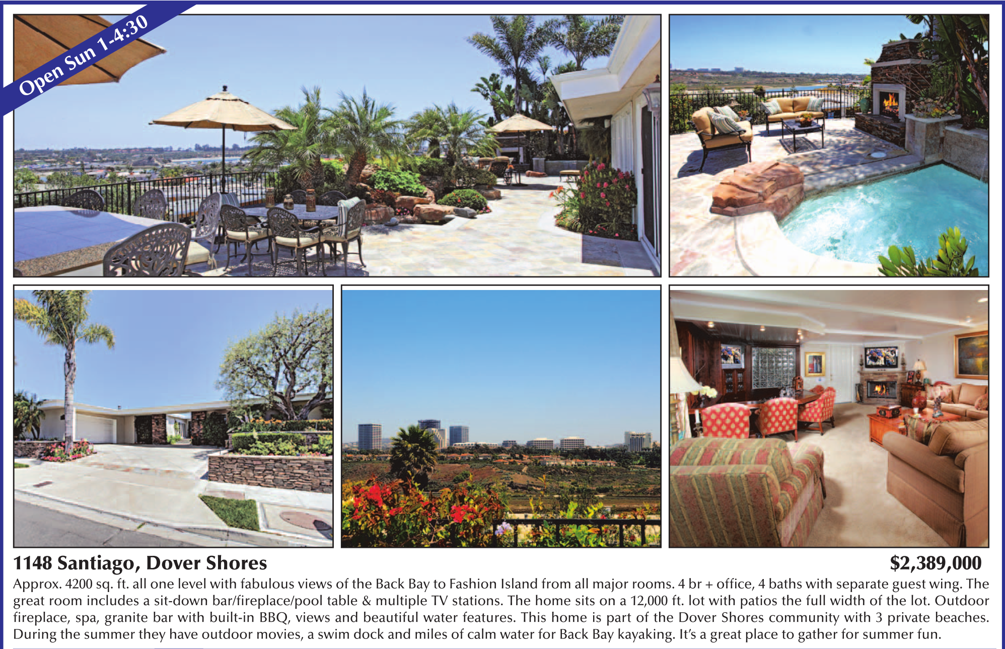 Approx. 4200 sq. ft. all one level with fabulous views of the Back Bay to Fashion Island from all major rooms. 4 br + office, 4 baths with separate guest wing. The great room includes a sit-down bar/fireplace/pool table & multiple TV stations. The home sits on a 12,000 ft. lot with patios the full width of the lot. Outdoor fireplace, spa, granite bar with built-in BBQ, views and beautiful water features. This home is part of the Dover Shores community with 3 private beaches. During the summer they have outdoor movies, a swim dock and miles of calm water for Back Bay kayaking. It’s a great place to gather for summer fun.