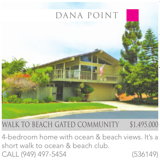 WALK TO BEACH GATED COMMUNITY $1,495,000 4-bedroom home with ocean & beach views. It’s a short walk to ocean & beach club. CALL (949) 497-5454 (536149)