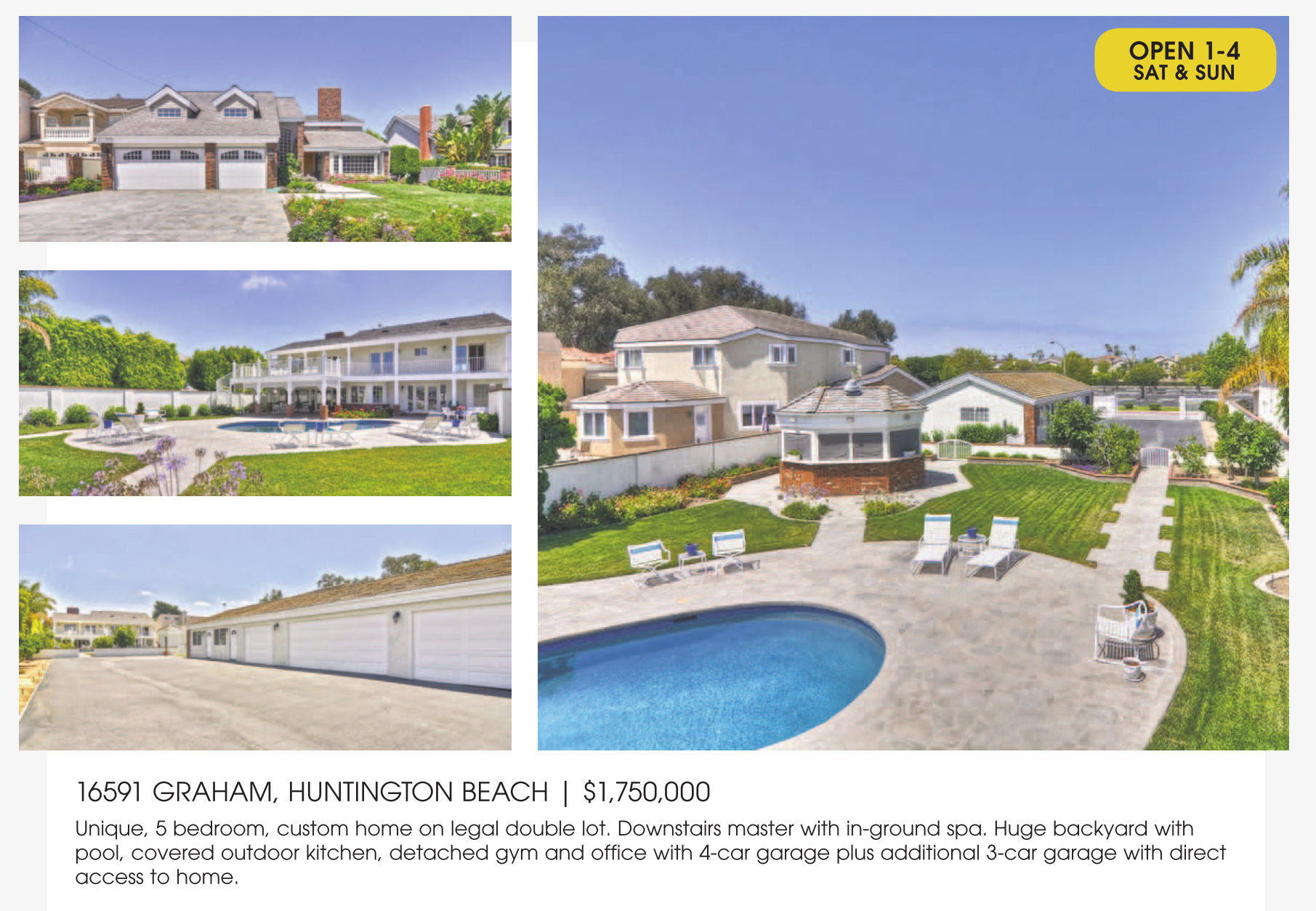OPEN 1-4 SAT & SUN 16591 GRAHAM, HUNTINGTON BEACH | $1,750,000 Unique, 5 bedroom, custom home on legal double lot. Downstairs master with in-ground spa. Huge backyard with pool, covered outdoor kitchen, detached gym and office with 4-car garage plus additional 3-car garage with direct access to home. See also