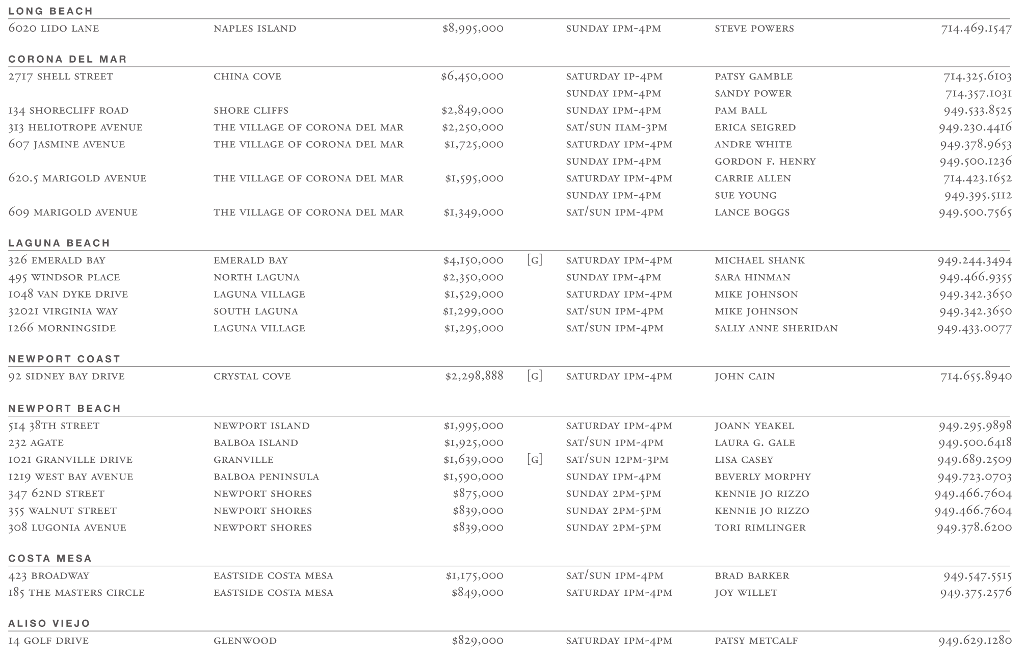 514 38th street newport island $1,995,000 saturday 1pm-4pm joann yeakel 949.295.9898 232 agate balboa island $1,925,000 sat/sun 1pm-4pm laura g. gale 949.500.6418 1021 granville drive granville $1,639,000 [g] sat/sun 12pm-3pm lisa casey 949.689.2509 1219 west bay avenue balboa peninsula $1,590,000 sunday 1pm-4pm beverly morphy 949.723.0703 347 62nd street newport shores $875,000 sunday 2pm-5pm kennie jo rizzo 949.466.7604 355 walnut street newport shores $839,000 sunday 2pm-5pm kennie jo rizzo 949.466.7604 308 lugonia avenue newport shores $839,000 sunday 2pm-5pm tori rimlinger 949.378.6200