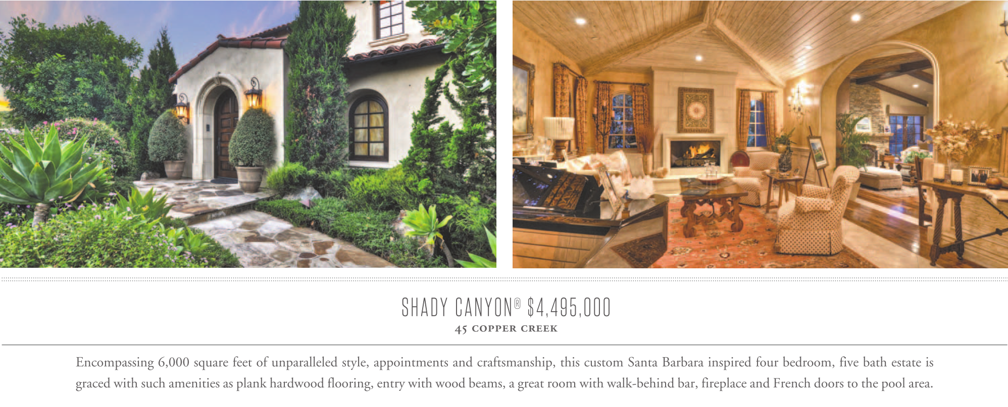 SHADY CANYON ® $4,495,000 45 copper creek Encompassing 6,000 square feet of unparalleled style, appointments and craftsmanship, this custom Santa Barbara inspired four bedroom, five bath estate is graced with such amenities as plank hardwood flooring, entry with wood beams, a great room with walk-behind bar, fireplace and French doors to the pool area.