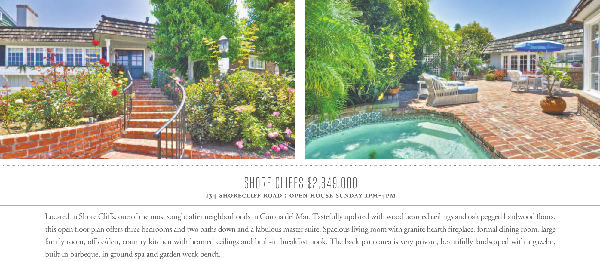 SHORE CLIFFS $2,849,000 134 shorecliff road : open house sunday 1pm-4pm Located in Shore Cliffs, one of the most sought after neighborhoods in Corona del Mar. Tastefully updated with wood beamed ceilings and oak pegged hardwood floors, this open floor plan offers three bedrooms and two baths down and a fabulous master suite. Spacious living room with granite hearth fireplace, formal dining room, large family room, office/den, country kitchen with beamed ceilings and built-in breakfast nook. The back patio area is very private, beautifully landscaped with a gazebo, built-in barbeque, in ground spa and garden work bench.