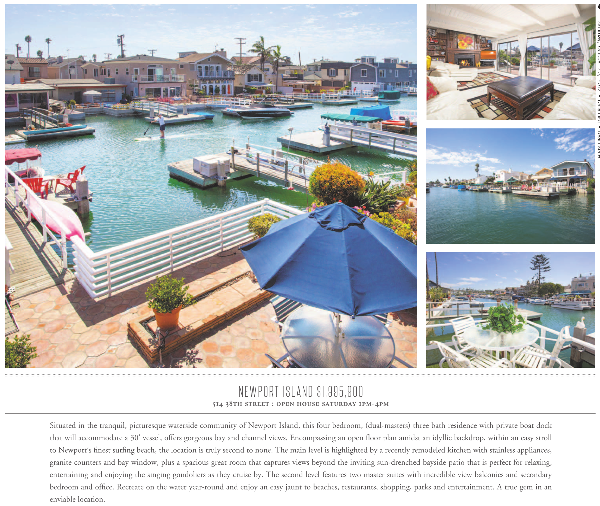 41 NEWPORT ISLAND $1,995,900 514 38th street : open house saturday 1pm-4pm Situated in the tranquil, picturesque waterside community of Newport Island, this four bedroom, (dual-masters) three bath residence with private boat dock that will accommodate a 30' vessel, offers gorgeous bay and channel views. Encompassing an open floor plan amidst an idyllic backdrop, within an easy stroll to Newport’s finest surfing beach, the location is truly second to none. The main level is highlighted by a recently remodeled kitchen with stainless appliances, granite counters and bay window, plus a spacious great room that captures views beyond the inviting sun-drenched bayside patio that is perfect for relaxing, entertaining and enjoying the singing gondoliers as they cruise by. The second level features two master suites with incredible view balconies and secondary bedroom and office. Recreate on the water year-round and enjoy an easy jaunt to beaches, restaurants, shopping, parks and entertainment. A true gem in an enviable location.