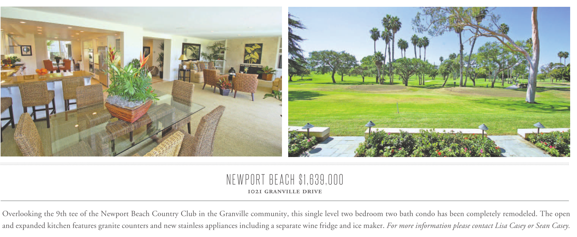 NEWPORT BEACH $1,639,000 1021 granville drive Overlooking the 9th tee of the Newport Beach Country Club in the Granville community, this single level two bedroom two bath condo has been completely remodeled. The open and expanded kitchen features granite counters and new stainless appliances including a separate wine fridge and ice maker. For more information please contact Lisa Casey or Sean Casey.