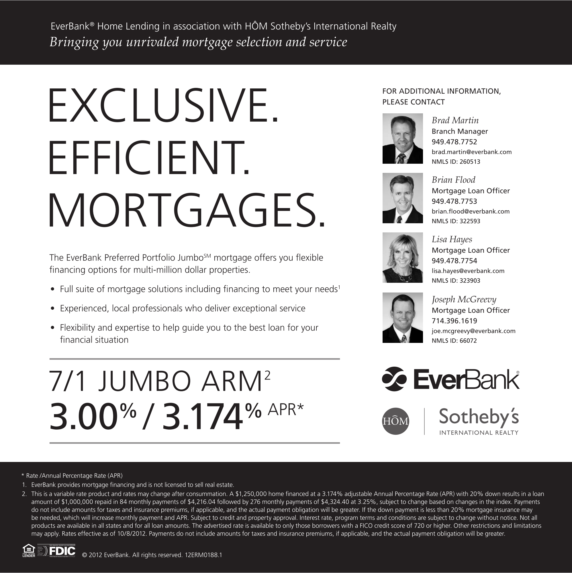 * Rate /Annual Percentage Rate (APR) 1. EverBank provides mortgage financing and is not licensed to sell real estate. 2. This is a variable rate product and rates may change after consummation. A $1,250,000 home financed at a 3.174% adjustable Annual Percentage Rate (APR) with 20% down results in a loan amount of $1,000,000 repaid in 84 monthly payments of $4,216.04 followed by 276 monthly payments of $4,324.40 at 3.25%, subject to change based on changes in the index. Payments do not include amounts for taxes and insurance premiums, if applicable, and the actual payment obligation will be greater. If the down payment is less than 20% mortgage insurance may be needed, which will increase monthly payment and APR. Subject to credit and property approval. Interest rate, program terms and conditions are subject to change without notice. Not all products are available in all states and for all loan amounts. The advertised rate is available to only those borrowers with a FICO credit score of 720 or higher. Other restrictions and limitations may apply. Rates effective as of 10/8/2012. Payments do not include amounts for taxes and insurance premiums, if applicable, and the actual payment obligation will be greater.