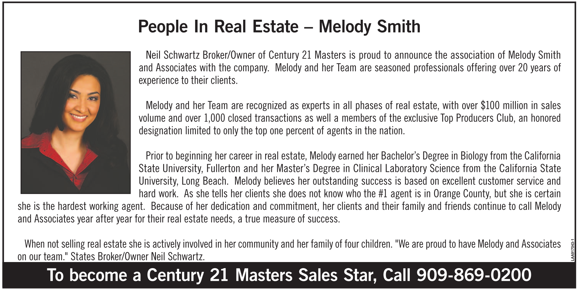 Neil Schwartz Broker/Owner of Century 21 Masters is proud to announce the association of Melody Smith and Associates with the company. Melody and her Team are seasoned professionals offering over 20 years of experience to their clients.