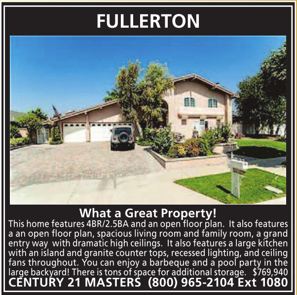 This home features 4BR/2.5BA and an open floor plan. It also features a an open floor plan, spacious living room and family room, a grand entry way with dramatic high ceilings. It also features a large kitchen with an island and granite counter tops, recessed lighting, and ceiling fans throughout. You can enjoy a barbeque and a pool party in the large backyard! There is tons of space for additional storage. $769,940 CENTURY 21 MASTERS (800) 965-2104 Ext 1080