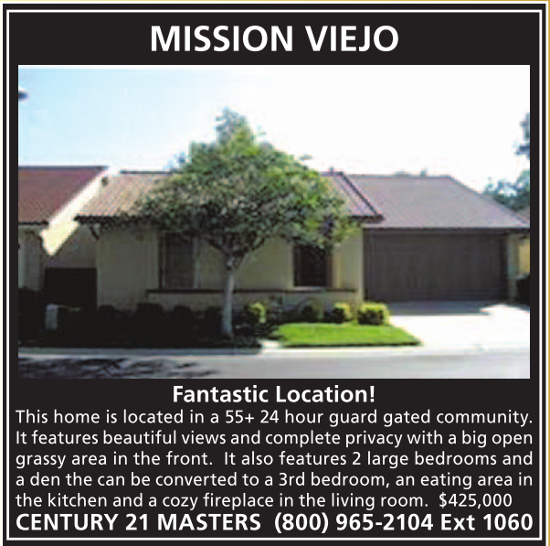 This home is located in a 55+ 24 hour guard gated community. It features beautiful views and complete privacy with a big open grassy area in the front. It also features 2 large bedrooms and a den the can be converted to a 3rd bedroom, an eating area in the kitchen and a cozy fireplace in the living room. $425,000 CENTURY 21 MASTERS (800) 965-2104 Ext 1060