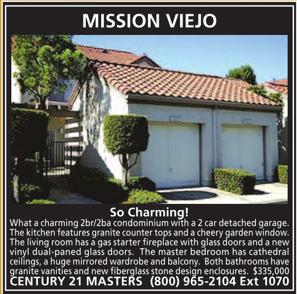 What a charming 2br/2ba condominium with a 2 car detached garage. The kitchen features granite counter tops and a cheery garden window. The living room has a gas starter fireplace with glass doors and a new vinyl dual-paned glass doors. The master bedroom has cathedral ceilings, a huge mirrored wardrobe and balcony. Both bathrooms have granite vanities and new fiberglass stone design enclosures. $335,000 CENTURY 21 MASTERS (800) 965-2104 Ext 1070