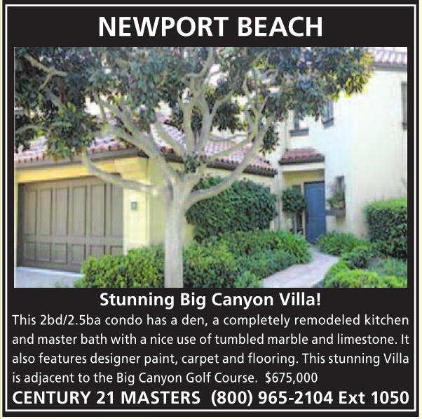 This 2bd/2.5ba condo has a den, a completely remodeled kitchen and master bath with a nice use of tumbled marble and limestone. It also features designer paint, carpet and flooring. This stunning Villa is adjacent to the Big Canyon Golf Course. $675,000 CENTURY 21 MASTERS (800) 965-2104 Ext 1050