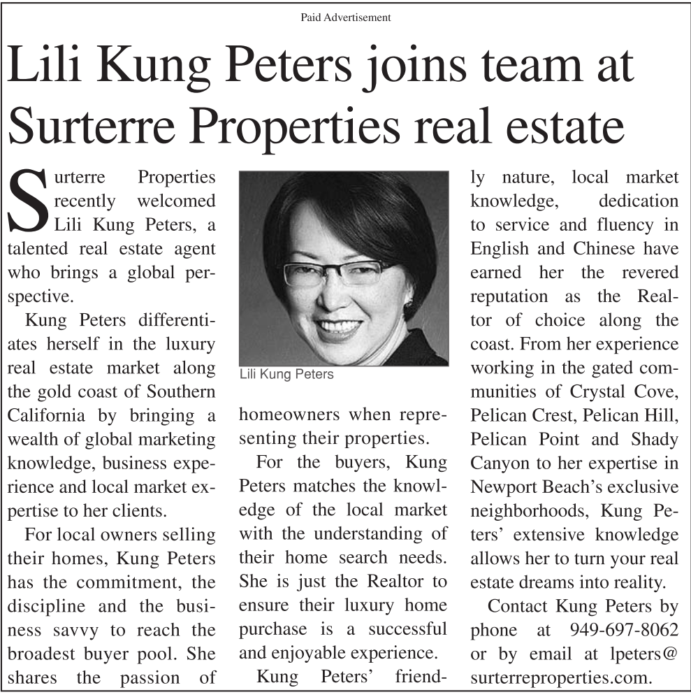 Paid Advertisement Lili Kung Peters joins team at Surterre Properties real estate Surterre Properties recently welcomed Lili Kung Peters, a talented real estate agent who brings a global perspective. Kung Peters differentiates herself in the luxury real estate market along the gold coast of Southern California by bringing a wealth of global marketing knowledge, business experience and local market expertise to her clients. For local owners selling their homes, Kung Peters has the commitment, the discipline and the business savvy to reach the broadest buyer pool. She shares the passion of Lili Kung Peters homeowners when representing their properties. For the buyers, Kung Peters matches the knowledge of the local market with the understanding of their home search needs. She is just the Realtor to ensure their luxury home purchase is a successful and enjoyable experience. Kung Peters’ friend ly nature, local market knowledge, dedication to service and fluency in English and Chinese have earned her the revered reputation as the Realtor of choice along the coast. From her experience working in the gated communities of Crystal Cove, Pelican Crest, Pelican Hill, Pelican Point and Shady Canyon to her expertise in Newport Beach’s exclusive neighborhoods, Kung Peters’ extensive knowledge allows her to turn your real estate dreams into reality. Contact Kung Peters by phone at 949-697-8062 or by email at lpeters@ surterreproperties.com. See also