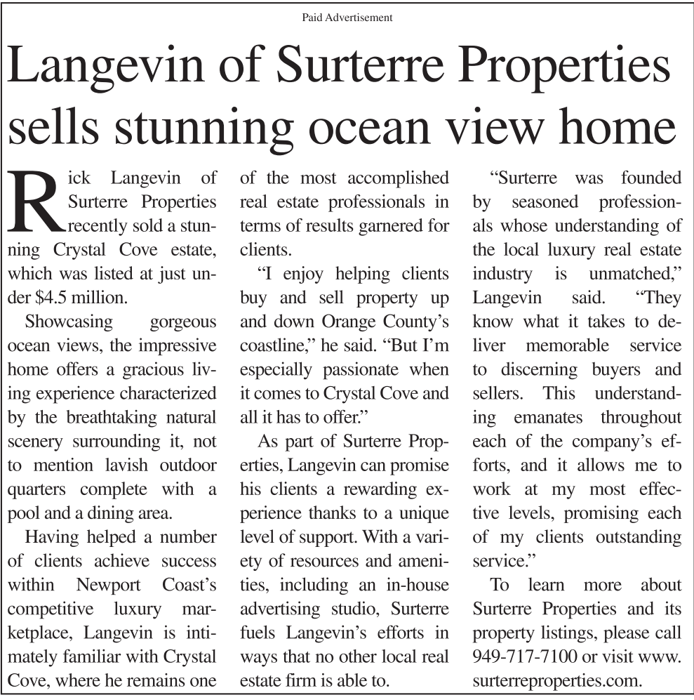 Langevin of Surterre Properties recently sold a stunning Crystal Cove estate, which was listed at just under $4.5 million.