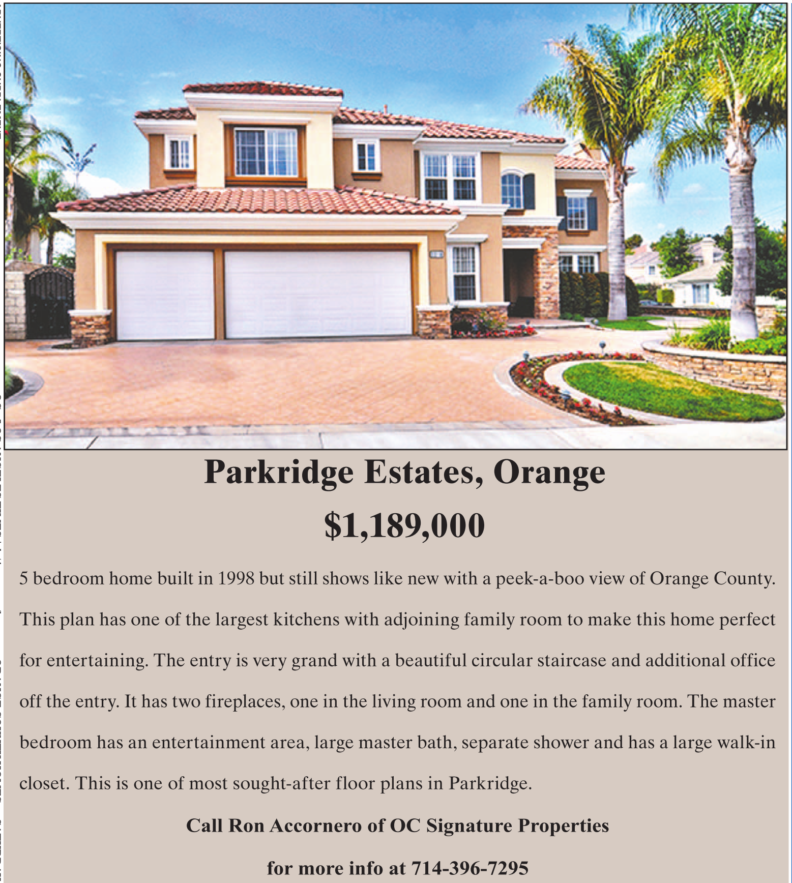 Parkridge Estates, Orange $1,189,000 5 bedroom home built in 1998 but still shows like new with a peek-a-boo view of Orange County. This plan has one of the largest kitchens with adjoining family room to make this home perfect for entertaining. The entry is very grand with a beautiful circular staircase and additional office off the entry. It has two fireplaces, one in the living room and one in the family room. The master bedroom has an entertainment area, large master bath, separate shower and has a large walk-in closet. This is one of most sought-after floor plans in Parkridge. Call Ron Accornero of OC Signature Properties for more info at 714-396-7295