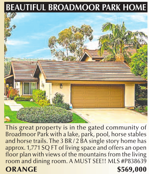 This great property is in the gated community of Broadmoor Park with a lake, park, pool, horse stables and horse trails. The 3 BR / 2 BA single story home has approx. 1,771 SQ FT of living space and offers an open floor plan with views of the mountains from the living room and dining room. A MUST SEE!! MLS #P838639 ORANGE $569,000