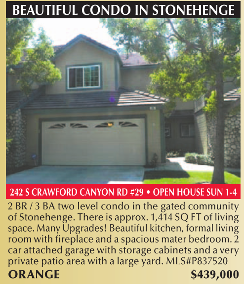 242 S CRAWFORD CANYON RD #29 • OPEN HOUSE SUN 1-4 2 BR / 3 BA two level condo in the gated community of Stonehenge. There is approx. 1,414 SQ FT of living space. Many Upgrades! Beautiful kitchen, formal living room with fireplace and a spacious mater bedroom. 2 car attached garage with storage cabinets and a very private patio area with a large yard. MLS#P837520 ORANGE $439,000