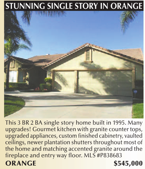 STUNNING SINGLE STORY IN ORANGE This 3 BR 2 BA single story home built in 1995. Many upgrades! Gourmet kitchen with granite counter tops, upgraded appliances, custom finished cabinetry, vaulted ceilings, newer plantation shutters throughout most of the home and matching accented granite around the fireplace and entry way floor. MLS #P838683 ORANGE $545,000