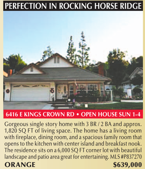 PERFECTION IN ROCKING HORSE RIDGE 6416 E KINGS CROWN RD • OPEN HOUSE SUN 1-4 Gorgeous single story home with 3 BR / 2 BA and approx. 1,820 SQ FT of living space. The home has a living room with fireplace, dining room, and a spacious family room that opens to the kitchen with center island and breakfast nook. The residence sits on a 6,000 SQ FT corner lot with beautiful landscape and patio area great for entertaining. MLS #P837270 ORANGE $639,000