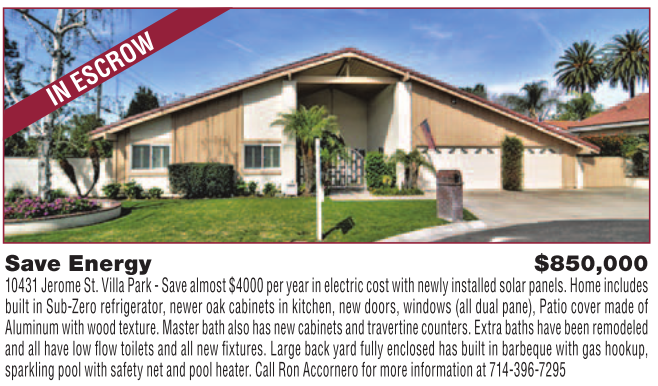 Save Energy $850,000 10431 Jerome St. Villa Park - Save almost $4000 per year in electric cost with newly installed solar panels. Home includes built in Sub-Zero refrigerator, newer oak cabinets in kitchen, new doors, windows (all dual pane), Patio cover made of Aluminum with wood texture. Master bath also has new cabinets and travertine counters. Extra baths have been remodeled and all have low fl ow toilets and all new fi xtures. Large back yard fully enclosed has built in barbeque with gas hookup, sparkling pool with safety net and pool heater. Call Ron Accornero for more information at 714-396-7295