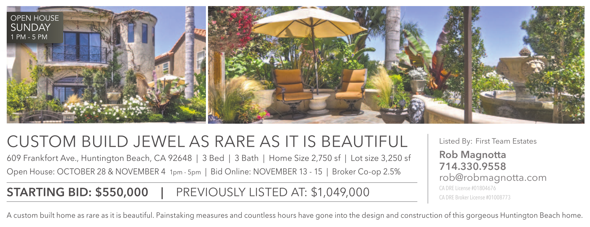 OPEN HOUSE SUNDAY 1 PM - 5 PM CUSTOM BUILD JEWEL AS RARE AS IT IS BEAUTIFUL 609 Frankfort Ave., Huntington Beach, CA 92648 | 3 Bed | 3 Bath | Home Size 2,750 sf | Lot size 3,250 sf Open House: OCTOBER 28 & NOVEMBER 4 1pm - 5pm | Bid Online: NOVEMBER 13 - 15 | Broker Co-op 2.5% STARTING BID: $550,000 | PREVIOUSLY LISTED AT: $1,049,000 Listed By: First Team Estates Rob Magnotta 714.330.9558 rob@robmagnotta.com CA DRE License #01804676 CA DRE Broker License #01008773 A custom built home as rare as it is beautiful. Painstaking measures and countless hours have gone into the design and construction of this gorgeous Huntington Beach home. See also