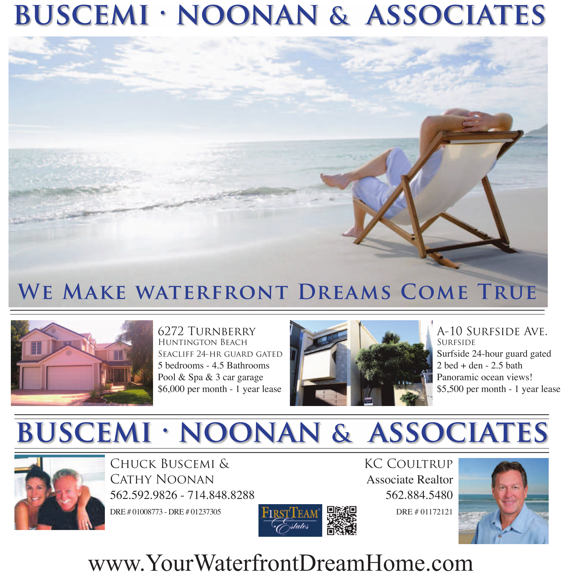 buscemi · noonan & associates We M ake waterfront Drea ms Come True 6272 Turnberry Huntington Beach Seacliff 24-hr guard gated 5 bedrooms - 4.5 Bathrooms Pool & Spa & 3 car garage $6,000 per month - 1 year lease A-10 Surfside Ave. Surfside Surfside 24-hour guard gated 2 bed + den - 2.5 bath Panoramic ocean views! $5,500 per month - 1 year lease buscemi · noonan & associates Chuck Buscemi & Cathy Noonan 562.592.9826 - 714.848.8288 DRE # 01008773 - DRE # 01237305 KC Coultrup Associate Realtor 562.884.5480 DRE # 01172121