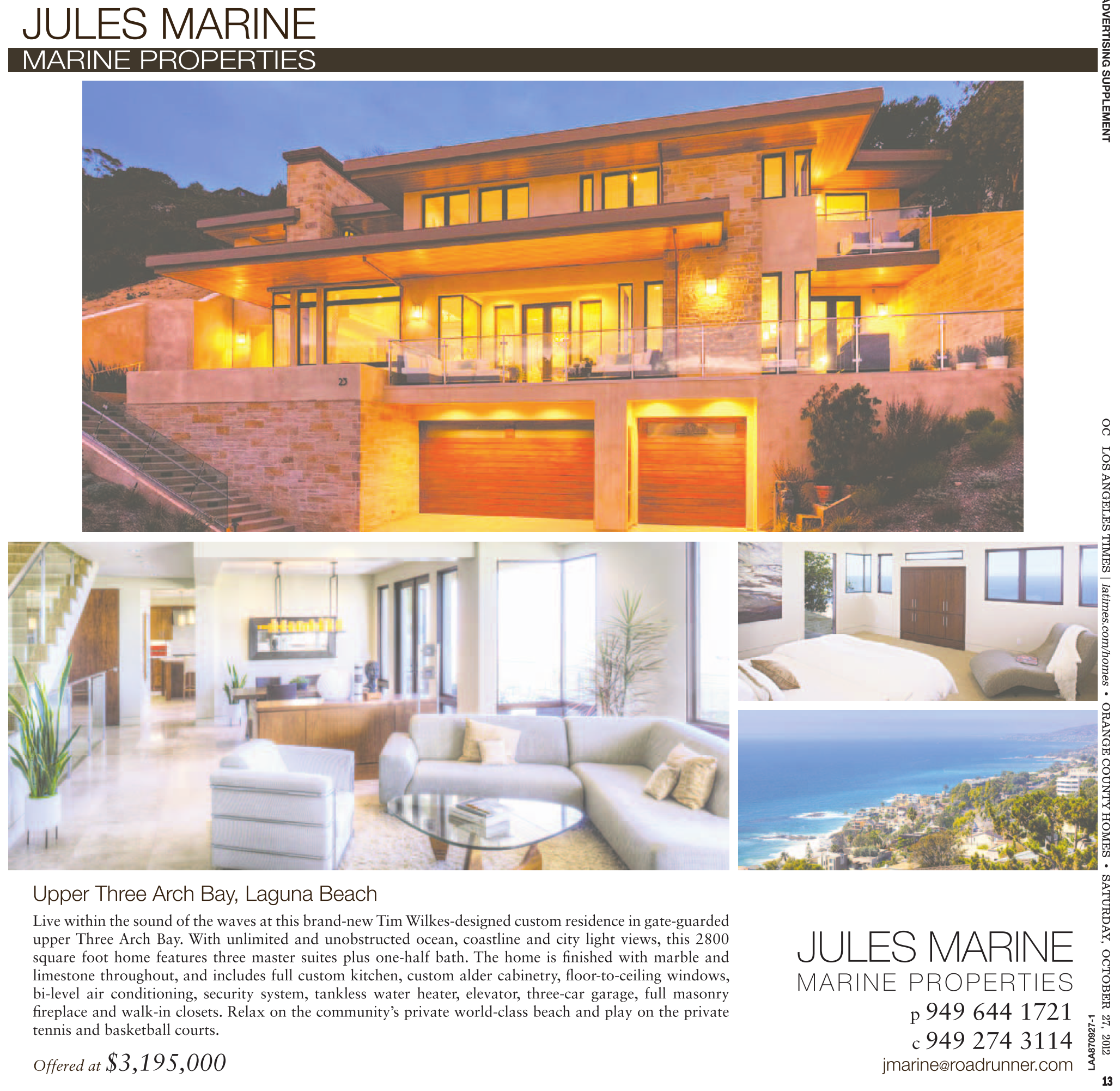 JULES MARINE MARINE PROPERTIES M A R I N E P R O P E R T I E S Upper Three Arch Bay, Laguna Beach Live within the sound of the waves at this brand-new Tim Wilkes-designed custom residence in gate-guarded upper Three Arch Bay. With unlimited and unobstructed ocean, coastline and city light views, this 2800 square foot home features three master suites plus one-half bath. The home is finished with marble and limestone throughout, and includes full custom kitchen, custom alder cabinetry, floor-to-ceiling windows, bi-level air conditioning, security system, tankless water heater, elevator, three-car garage, full masonry fireplace and walk-in closets. Relax on the community’s private world-class beach and play on the private tennis and basketball courts. Offered at $3,195,000 JULES MARINE M A R I N E P R O P E R T I E S p 949 644 1721 c 949 274 3114 jmarine@roadrunner.com 13