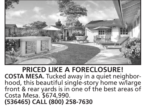 COSTA MESA. Tucked away in a quiet neighborhood, this beautiful single-story home w/large front & rear yards is in one of the best areas of Costa Mesa. $674,990. (536465) CALL (800) 258-7630
