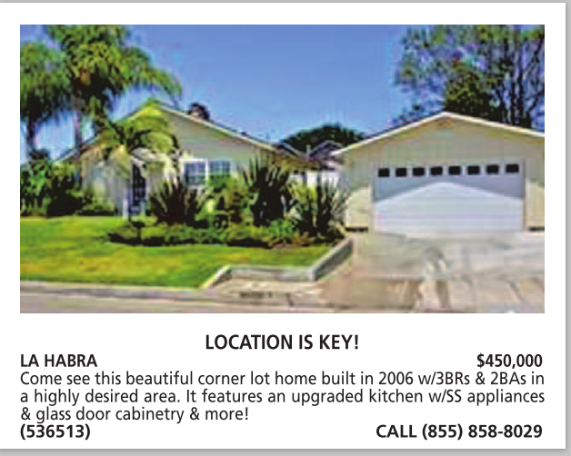 LA HABRA $450,000 Come see this beautiful corner lot home built in 2006 w/3BRs & 2BAs in a highly desired area. It features an upgraded kitchen w/SS appliances & glass door cabinetry & more! (536513) CALL (855) 858-8029
