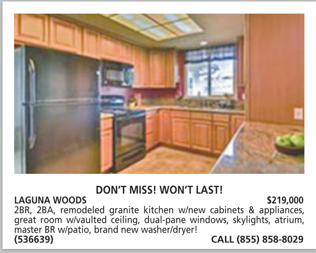 LAGUNA WOODS $219,000 2BR, 2BA, remodeled granite kitchen w/new cabinets & appliances, great room w/vaulted ceiling, dual-pane windows, skylights, atrium, master BR w/patio, brand new washer/dryer! (536639) CALL (855) 858-8029