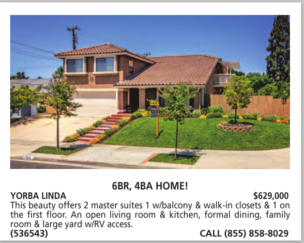 YORBA LINDA $629,000 This beauty offers 2 master suites 1 w/balcony & walk-in closets & 1 on the first floor. An open living room & kitchen, formal dining, family room & large yard w/RV access. (536543) CALL (855) 858-8029