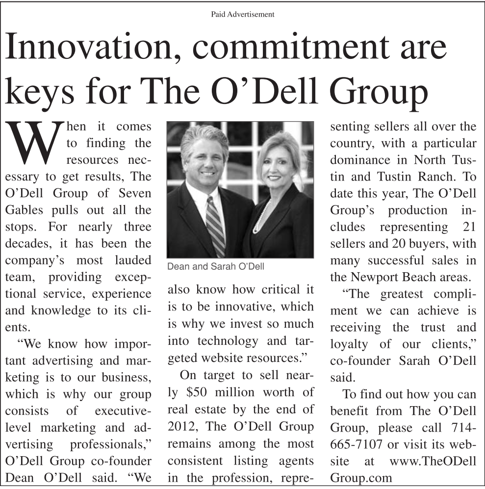 Paid Advertisement Innovation, commitment are keys for The O’Dell Group When it comes to finding the resources necessary to get results, The O’Dell Group of Seven Gables pulls out all the stops. For nearly three decades, it has been the company’s most lauded team, providing exceptional service, experience and knowledge to its clients. “We know how important advertising and marketing is to our business, which is why our group consists of executivelevel marketing and advertising professionals,” O’Dell Group co-founder Dean O’Dell said. “We Dean and Sarah O’Dell also know how critical it is to be innovative, which is why we invest so much into technology and targeted website resources.” On target to sell nearly $50 million worth of real estate by the end of 2012, The O’Dell Group remains among the most consistent listing agents in the profession, repre senting sellers all over the country, with a particular dominance in North Tustin and Tustin Ranch. To date this year, The O’Dell Group’s production includes representing 21 sellers and 20 buyers, with many successful sales in the Newport Beach areas. “The greatest compliment we can achieve is receiving the trust and loyalty of our clients,” co-founder Sarah O’Dell said. To find out how you can benefit from The O’Dell Group, please call 714- 665-7107 or visit its website at www.TheODell Group.com See also