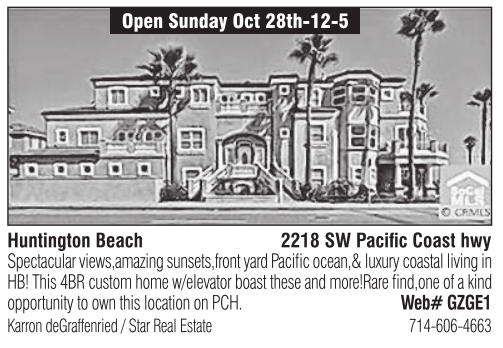 Open Sunday Oct 28th-12-5 Huntington Beach 2218 SW Pacific Coast hwy Spectacular views,amazing sunsets,front yard Pacific ocean,& luxury coastal living in HB! This 4BR custom home w/elevator boast these and more!Rare find,one of a kind opportunity to own this location on PCH. Web# GZGE1 Karron deGraffenried / Star Real Estate 714-606-4663