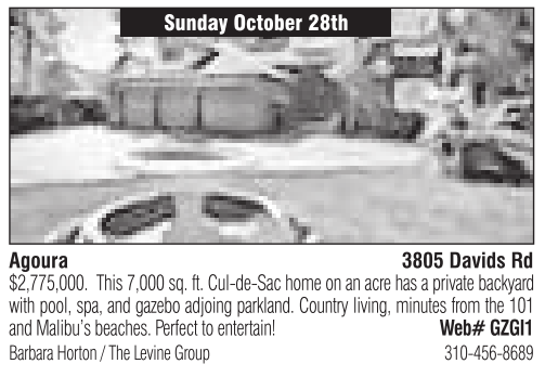 Agoura 3805 Davids Rd $2,775,000. This 7,000 sq. ft. Cul-de-Sac home on an acre has a private backyard with pool, spa, and gazebo adjoing parkland. Country living, minutes from the 101 and Malibu’s beaches. Perfect to entertain! Web# GZGI1 Barbara Horton / The Levine Group 310-456-8689
