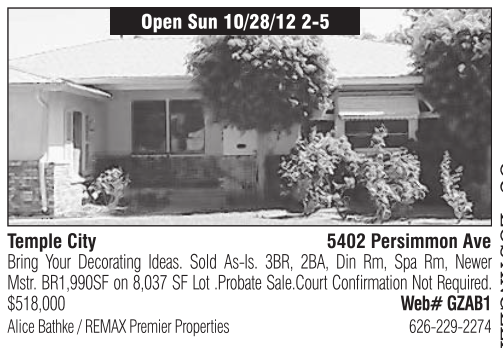 Temple City 5402 Persimmon Ave Bring Your Decorating Ideas. Sold As-Is. 3BR, 2BA, Din Rm, Spa Rm, Newer Mstr. BR1,990SF on 8,037 SF Lot .Probate Sale.Court Confirmation Not Required. $518,000 Web# GZAB1 Alice Bathke / REMAX Premier Properties 626-229-2274