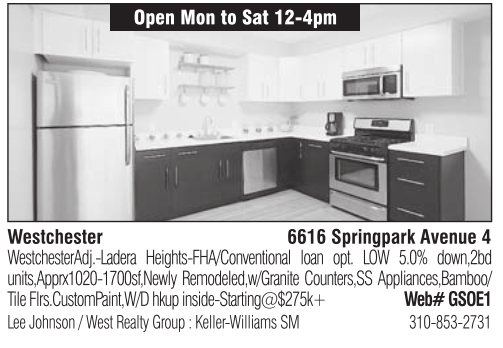Open Mon to Sat 12-4pm Westchester 6616 Springpark Avenue 4 WestchesterAdj.-Ladera Heights-FHA/Conventional loan opt. LOW 5.0% down,2bd units,Apprx1020-1700sf,Newly Remodeled,w/Granite Counters,SS Appliances,Bamboo/ Tile Flrs.CustomPaint,W/D hkup inside-Starting@$275k+ Web# GSOE1 Lee Johnson / West Realty Group : Keller-Williams SM 310-853-2731 See also